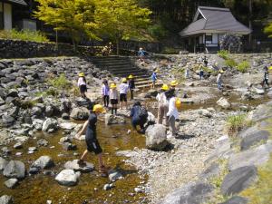 熊野神社では、神社のきまりやはだか祭りのことを神主さんや現地の方に教えていただき、最後は、川やアスレチックで遊びました。