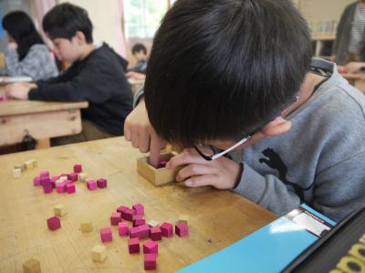 体積のイメージがわきにくい子も多いので、ブロックを使って体験的に意味を理解できるような工夫をしています。