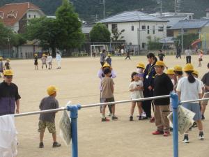 その時間、子どもたちで運動場はあふれかえっています。その中でも、自分たちの班のメンバーでドッチボールや鬼ごっこなどしています。鬼ごっこやけいどろでは、メンバーをちゃんと覚えて、追いかけあいもしています。