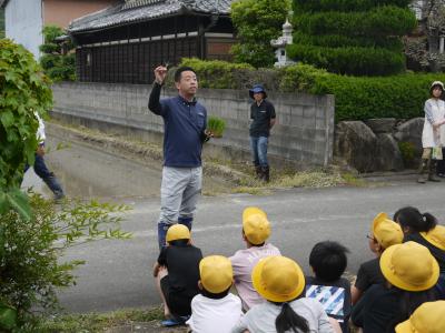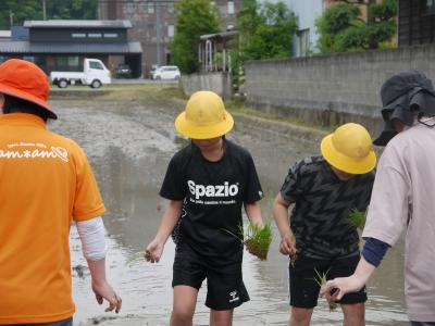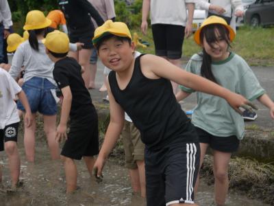 地域の方々や保護者の方々に多数ご協力いただき、無事、田植え体験が終わりました。