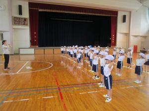 くま、かえる、うさぎ、くも、赤ちゃんなど色んな生き物になりきって体を動かしました。授業の振り返りでは「みんなで体を動かして楽しかった。」と発表してくれるお友達もいました。並ぶ時の前ならえ、話を聞く姿勢を素早くできるように練習中です!