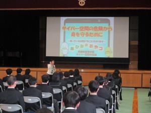 兵庫県警察本部サイバー犯罪対策課の本田さんによる講演で、いま実際に起こっている犯罪を例に、犯罪から身を守る方法を教えていただきました。スマホやコンピュータを使う機会が多くなっていますが、使い方を間違えると、犯罪に巻き込まれたり、逆に罪を犯したりすることなります。パスワードの管理は、もちろんのこと、ルールを守った使い方をしましょう。
