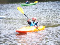 円山川公苑でカッター実習とカヌー・カヤック体験。長いオールを操り、艇長の合図に合わせタイミングよく漕ぎます。カヤック体験ではパドルを操作。だんだん上達し、スイスイと湖面を気持ちよく進みました。