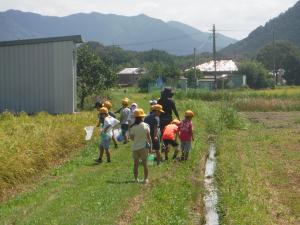 運動会の練習の合間に、1年生は近くに虫取りに出かけました。「どこにいるかなあ?」「いないなあ」」「おった!」「こっちや!」とバッタを見つけるたびに大騒ぎ。