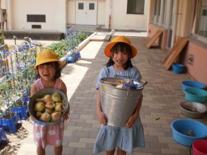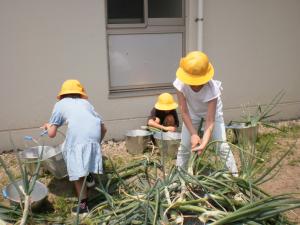 5月25日(水曜日)に、昨年度植えた玉ねぎを収穫しました。「わあ~、こんなに大きくなってる。」「大きなかぶみたいにみんなでひっぱろ。」「大きな玉ねぎは茎が太い。」など、暑い中がんばってバケツ12杯分も収穫できました。