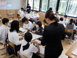 5月29日の2校時から5校時にかけて、4人の教育実習生が3週間の実習の成果を研究授業という形で発表しました。3年生の全クラスと1年生の1クラスで行いましたが、程よい緊張感(実習生も中学生も)の中、授業をすすめることができました。、