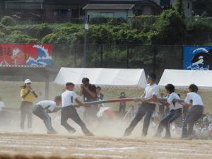 ここからは競技に移ります。まずはリズムジャンプ体操です。普段の体育の授業でも取り入れている準備体操です。その後、サバイバルリレー、棒引きと続きます。