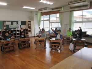 算数の時間にまっすぐに手をあげて、進んで発表する5年生